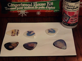This year I decided to make a little thing to add to the boys' gift bags. I took some normal guitar picks and put some pictures on them of either their wives, or some other love of theirs. Like these: